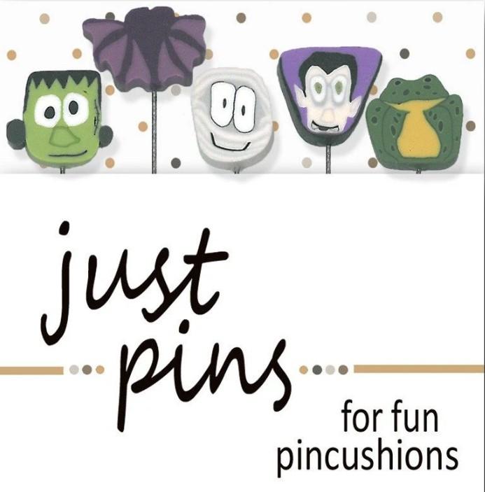 Just Pins Monster Mash. These monster pins are handmade from a Just Another Button Company button slice mounted on stainless steel sewing pins. Assortment of five, packaged in a paper folder. Use to embellish pincushions.