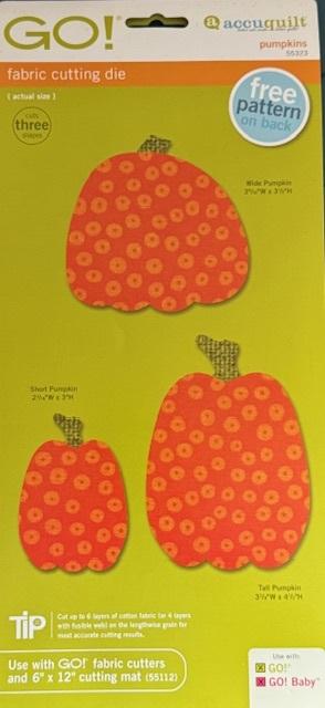 This die cuts three different pumpkins. Use for applique, cute quilts, garments, gift tags, home décor, holiday items, and much more! Apply fusible web to the wrong side of fabrics prior to cutting for quick and easy appliqué. Use with shapes from other AccuQuilt GO!® dies such as GO!® Fall Medley (55041).  Cut Size: Large Pumpkin: 3 1/8"W x 4 1/2"H (7.9 cm x 11.4 cm), Medium Pumpkin: 3 1/2"W x 3 1/2"H (8.9 cm x 8.9 cm), Small Pumpkin: 2"W x 3"H (5.1 cm x 7.6 cm).