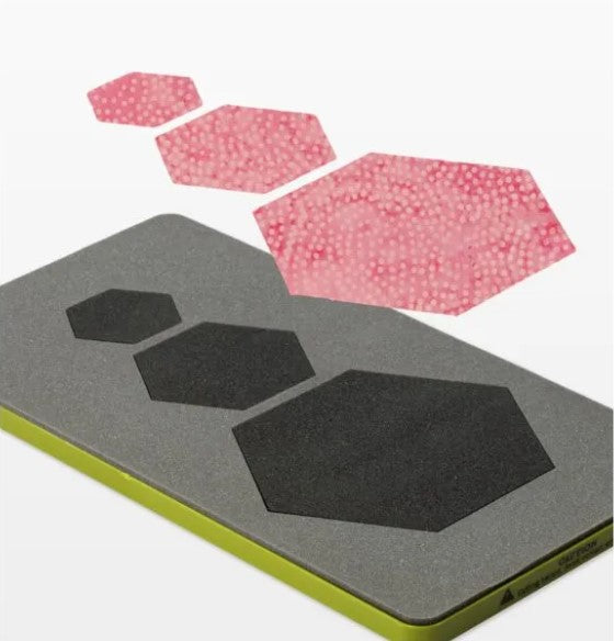 Traditional hexagon quilts like Grandmother's Flower Garden are absolutely beautiful, but it takes a whole lot of hexagons to make one quilt and just thinking about cutting all those shapes out can make your wrists ache. The AccuQuilt GO! Hexagon die cuts perfect shapes quickly, every time. This die cuts three sizes of hexagon from multiple layers of fabric. Try them on a variety of fabrics and let your imagination roam! Cut Size: One 1" sided hexagon (2.5 cm), One hexagon 1 1/2" sided hexagon (3.8 cm) and One 2 1/2" sided hexagon (6.4 cm).