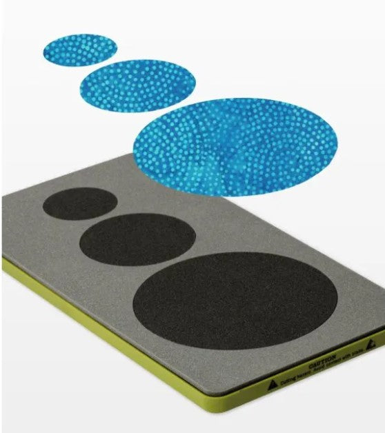 Using a rotary cutter or scissors to cut out circles is a trick -- you know how hard it is to cut this basic shape accurately. The AccuQuilt GO! Circle die makes it a breeze. This die cuts three sizes of perfect circles lickety split. Great for popular yo-yo projects and raw edge bull's-eye concentric circle quilt designs. Plus now polka dots, flower centers, large buttons, large eyes and apples and oranges are a snap. Make quick appliqués by applying fusible web to the wrong side of fabrics prior to cutting. Circles measure 2", 3", and 5".
