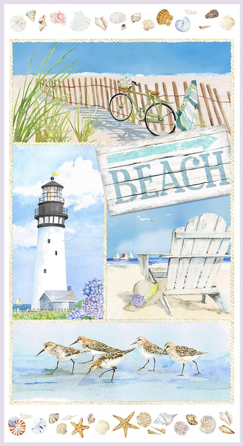 100% Cotton, 24" Panel featuring a majestic lighthouse and other beach themed motifs.